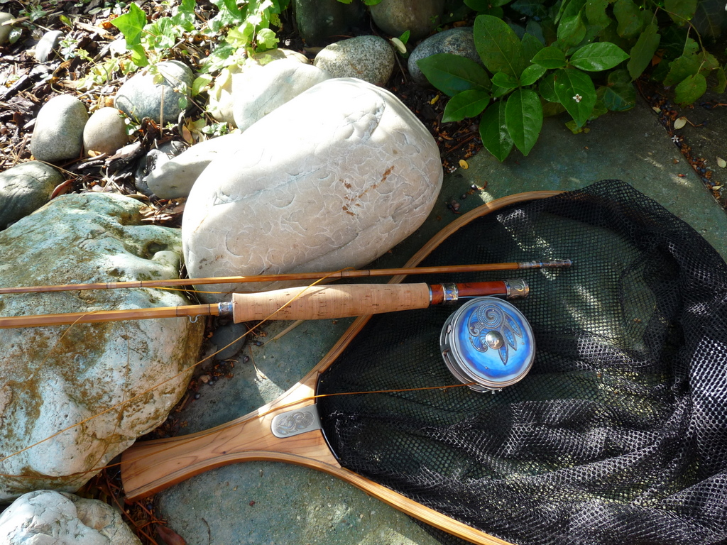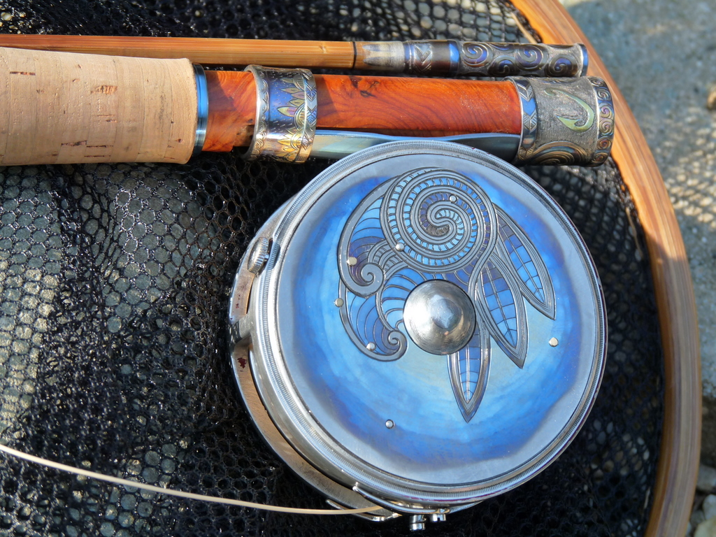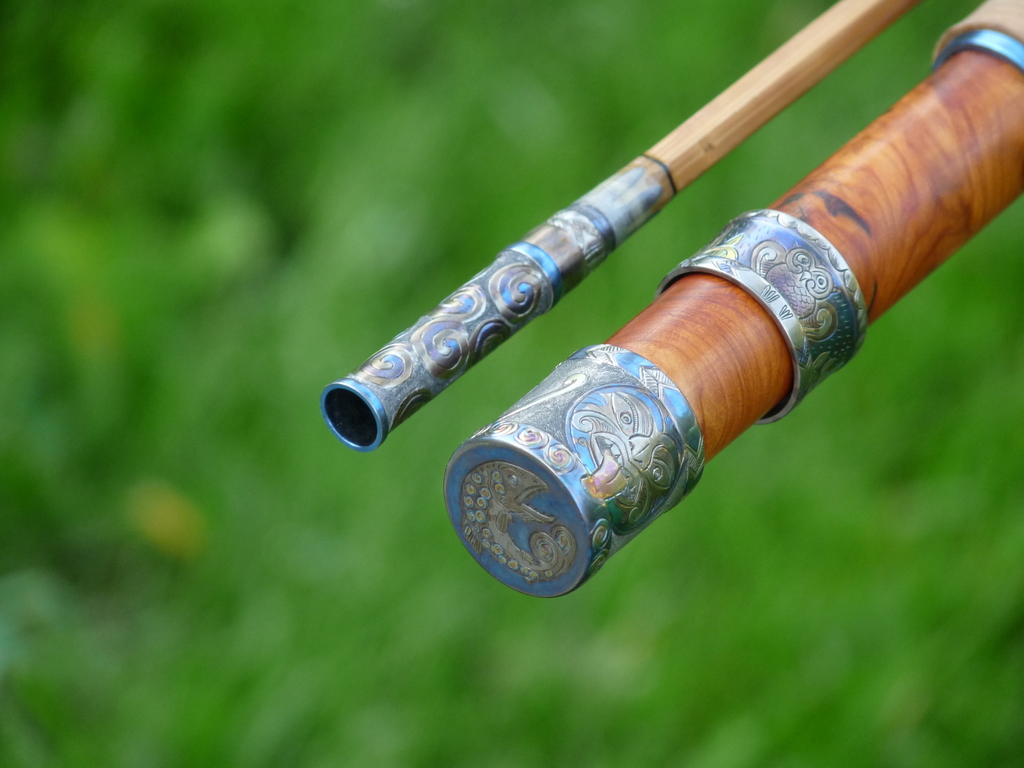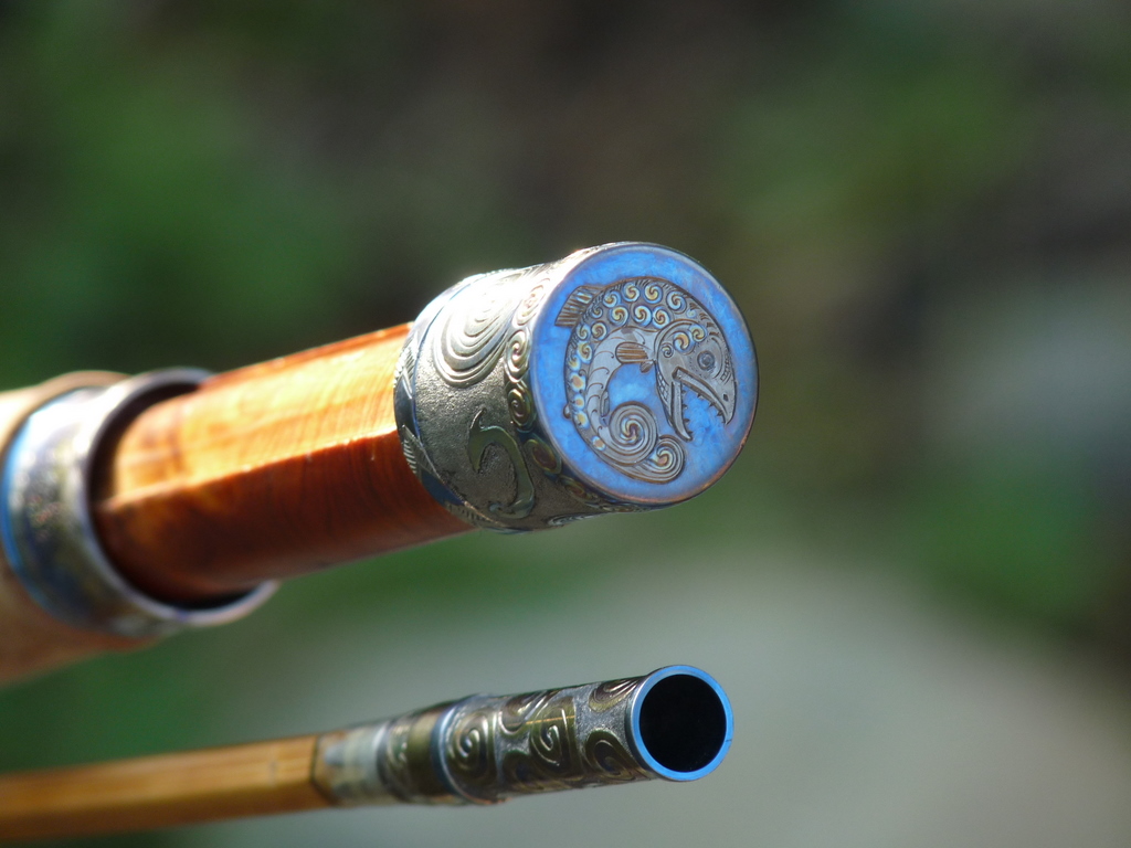 Il a réalisé le blank, un profil Alcibiade en bambou refendu de 7’2’’, il a également tourné le porte moulinet en if et les anneaux en agate. J’ai fait tout le reste, anneaux, viroles et bagues en titane, poignée et bien sûr la décoration de l’ensemble.