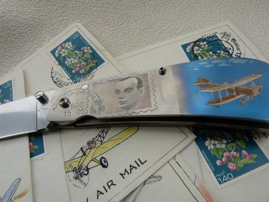 La gravure devait rappeler les petits avions que je dessinais sur les enveloppes des lettres que j’expédiais à sa maman lorsque elle l’attendait. L’avion gravé est un Latécoère, comme celui utilisé par les pionniers de l’aéropostale. Le timbre poste représente Saint Exupery lorsqu’il avait 30 ans et le cachet de la poste porte sa date de naissance.