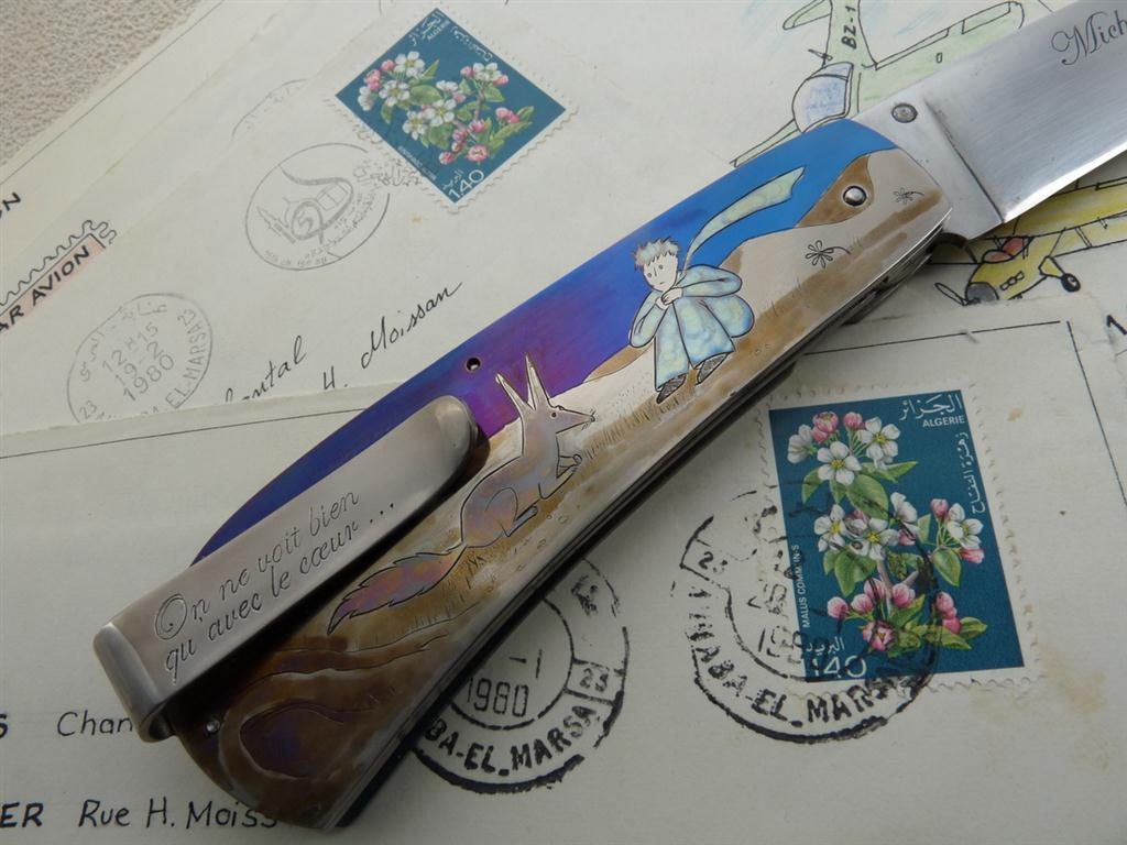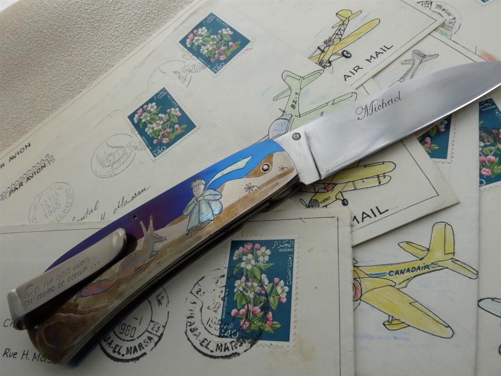 Sur l’autre côté du manche une scène inspirée par le Petit Prince montre l’instant où le renard, une fois apprivoisé, donne son secret au petit prince.