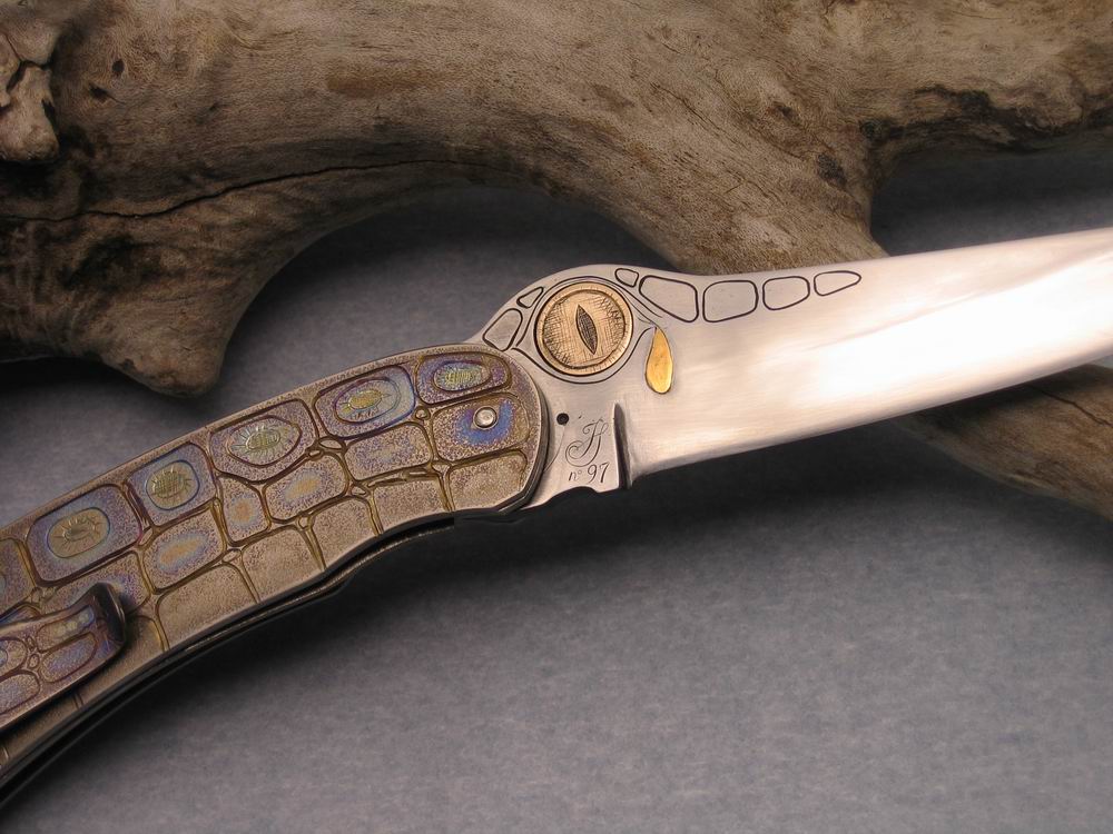 Un couteau à verrouillage de type liner-lock que j’ai fait en acier T9 M0. Il a la silhouette d’un crocodile et les platines en titane ont été gravées avec un motif en peau de croco. Les réflets en couleur du titane sont obtenus par anodisation et les larmes de crocodile sont incrustées en or 24K.