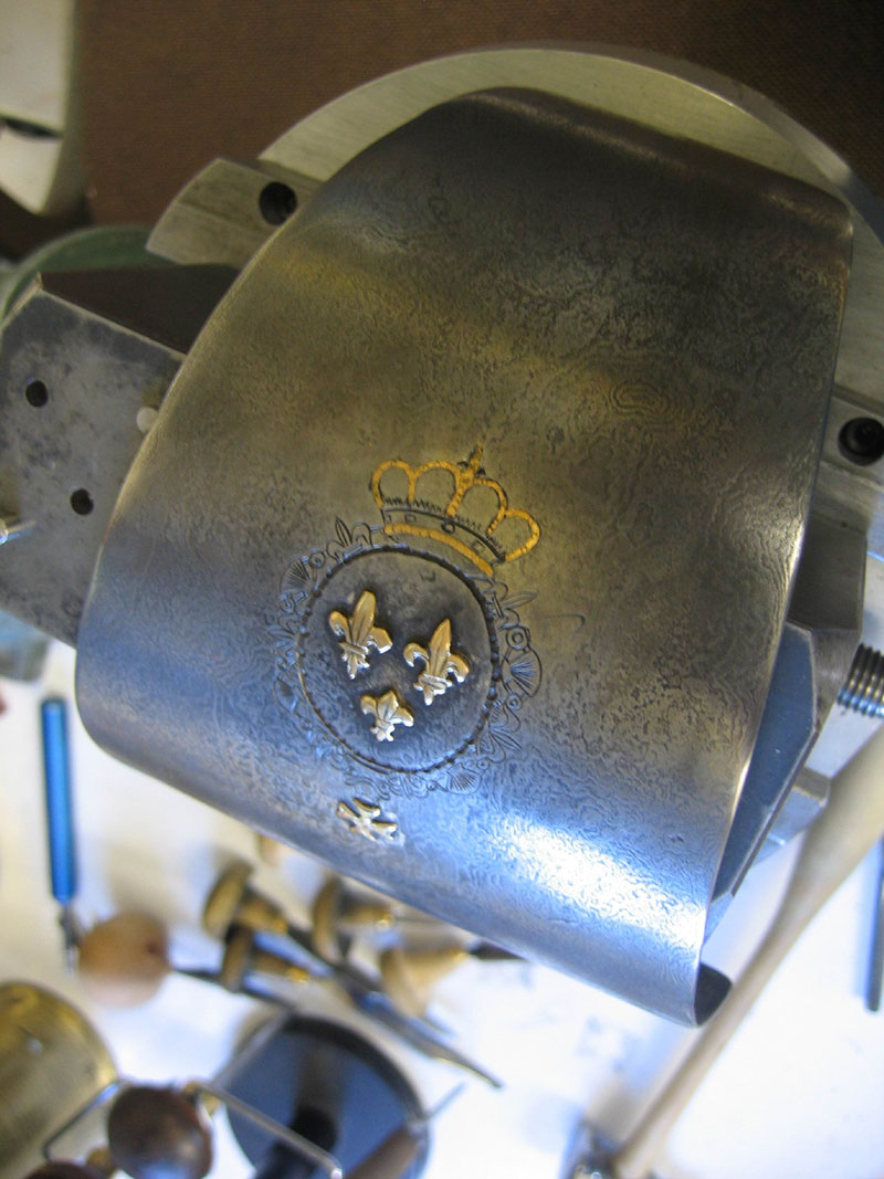Sur la coquille en damas d’une dague du XVIe forgée par Jean-Luc Soubeyras, j’ai mis pour la première fois à l’œuvre cette technique. La gravure demandée était les armes de France. Les fleurs de lys et la croix sont en feuille d’or 18 K brasées directement sur le damas. La couronne est en or 24K incrusté puis décoré au perloir .