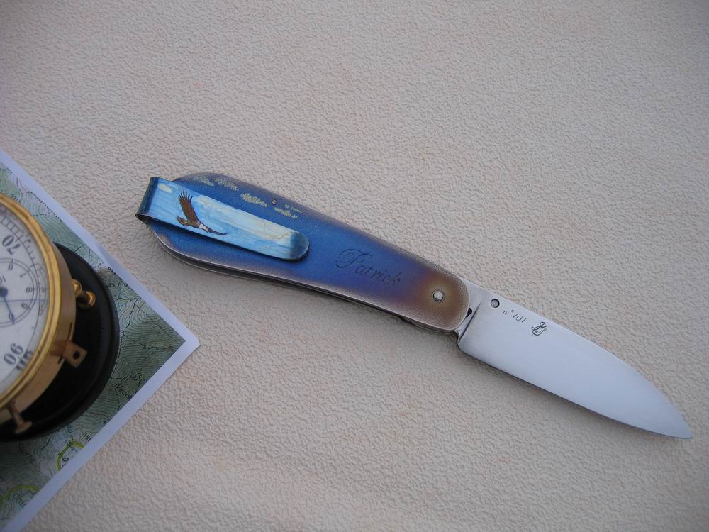 Un petit couteau liner-lock avec de platines en titane. Il est destiné à un amateur de deltaplane, il est décoré avec un motif de deltaplane et coloré par anodisation après la gravure.
