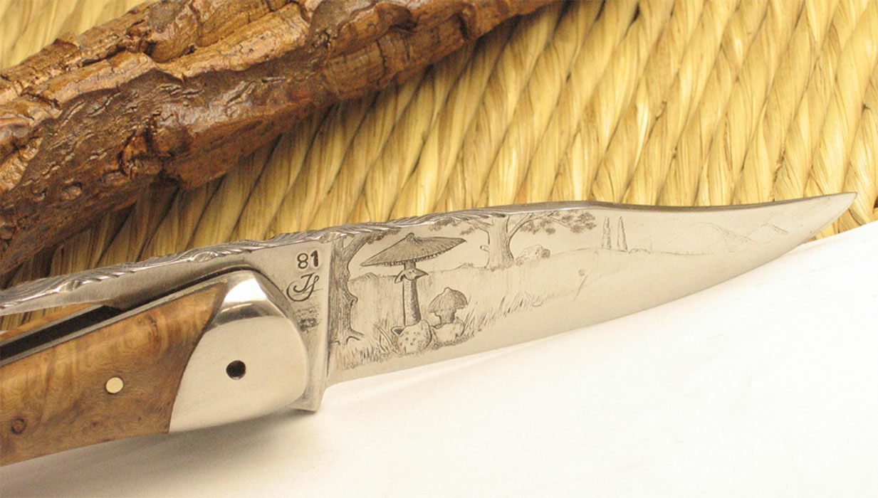 Un piémontais que j’ai forgé en acier T9 M0 avec une scène de champignons. C’est le cadeau de Noël 2006 de ma belle-mère Julienne. Je précise que le champignon est un oronge des césars et non une amanite phalloïde! La gravure est entièrement faite à l’échoppe pneumatique.
