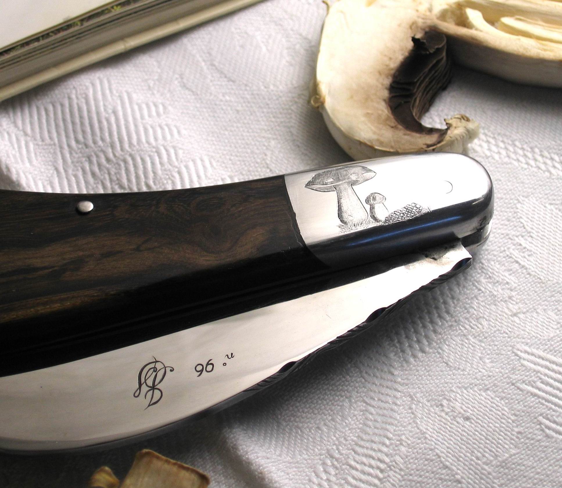 Couteau à cran forcé que j’ai forgé dans de l’acier T10 M0. Le manche est en cytise. Les mitres en inox sont gravées en taille douce avec des motifs de cèpes et girolles.